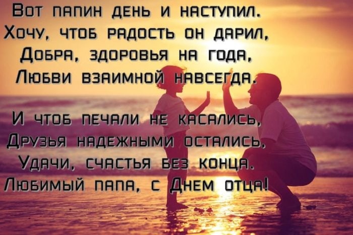 Кто такой отец и что он значит в нашей судьбе? Для маленького ребенка – папа является основной составляющей его жизни. Для подростка – папа становится тем человеком, который поможет разобраться в житейских вопросах. Для взрослого человека – папа, тот человек, который согреет в жизненную вьюгу и подставит плечо в беде. И не важно чей это папа – сына или дочки. Ведь папа – это половина мира. Без папы жизнь каждого из нас не может приобрести все краски и целостность бытия. Папы нужны девочкам мальчикам, детям и взрослым. Папы нужны детям. Папы нужны мамам, которые без их помощи не смогут вырастить полноценного гражданина общества. Без пап детство не может быть абсолютно счастливым. Папочка, я так рад(да), что ты есть в моей жизни. Спасибо тебе за то, что ты есть. Спасибо маме за то, что в моей жизни есть именно ты. С днем отца, ведь ты его лучший образец!