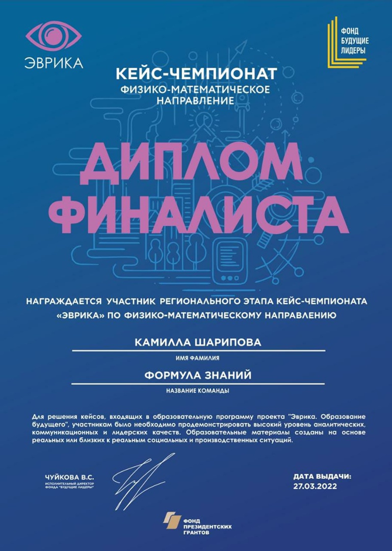 Ученица нашей школы Шарипова Камилла стала финалистом этого проекта, приняла участие 10.04.2022г. в федеральном этапе "Открытого кейс-чемпионата "Эврика" по физико-математическому направлению в г.Санкт-Петербург. Поздравляем Камиллу и желаем дальнейших побед!
