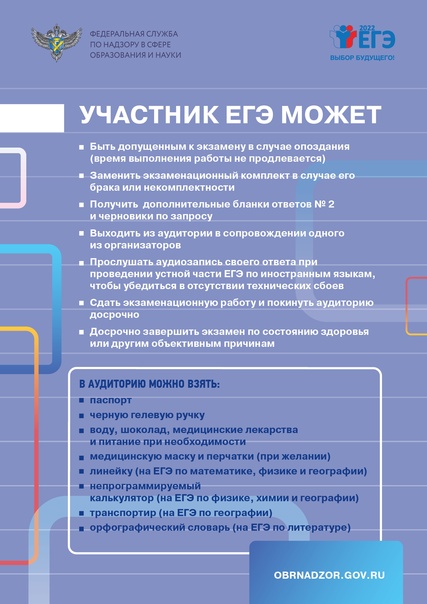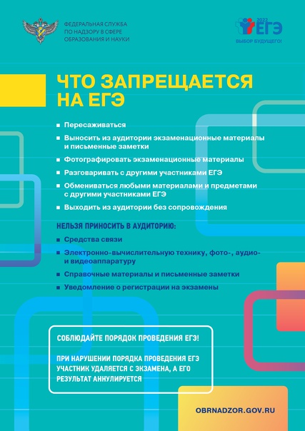 Федеральная служба по надзору в сфере образования и науки подготовила новые информационные плакаты для участников ЕГЭ. Из них выпускники могут получить полезную информацию о порядке проведения ЕГЭ, что можно и нельзя делать на экзаменах, особенностях сдаваемых предметов, порядке подачи апелляций, нововведениях 2022 года.